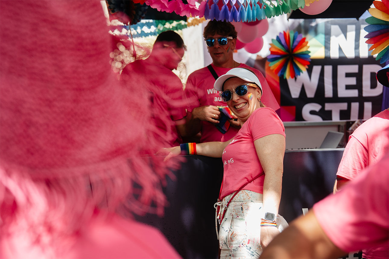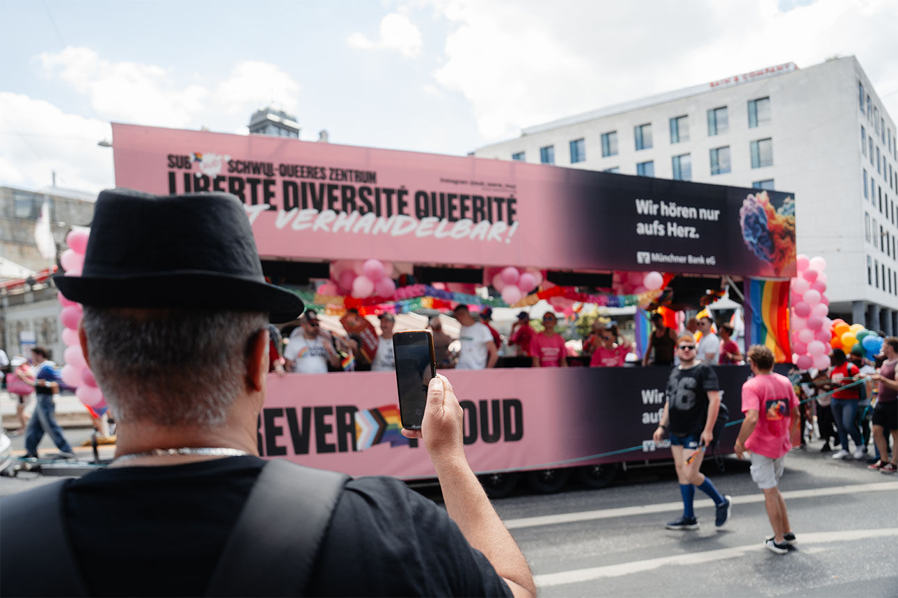 Schon seit über zehn Jahren setzt sich unsere Münchner Bank eG für mehr Farbe und Vielfalt in unserer Stadt ein. So sind wir bereits seit 2014 bei der PolitParade, dem Höhepunkt jedes Münchner CSD, mit dabei. Auch dieses Jahr zeigten unsere Mitarbeiterinnen und Mitarbeiter auf dem Wagen des Sub – dem Schwulen Kommunikations- und Kulturzentrum des CSD – Flagge. Denn genau wie beim CSD steht auch in unserer Genossenschaft immer der Mensch im Mittelpunkt.